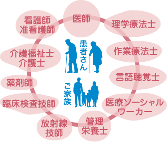 住み慣れた地域で最後まで暮らしたい、という地域の方々の声にこたえようと医師、看護師、准看護師、介護福祉士、介護士、薬剤師、理学療法士、作業療法士、言語聴覚士、臨床検査技師、放射線技師、管理栄養士、医療ソーシャルワーカーが一体となって、個々の患者さんに合った療養計画を立てケアを行います。定期的にご家族にも参加いただき、一緒に療養計画を考えながら、患者さんの病状や療養状況を判りやすくご説明、サポートさせていただきます。